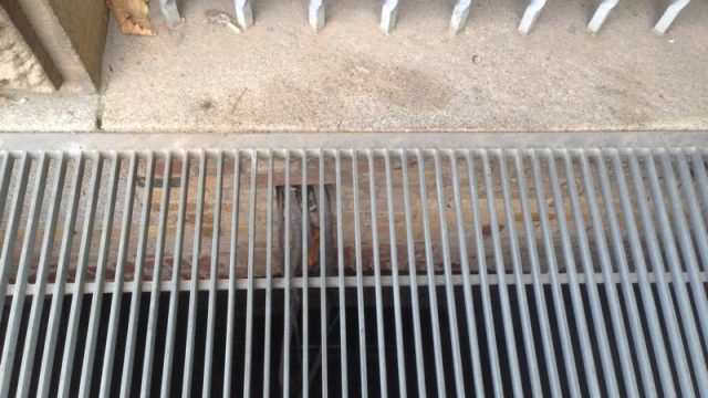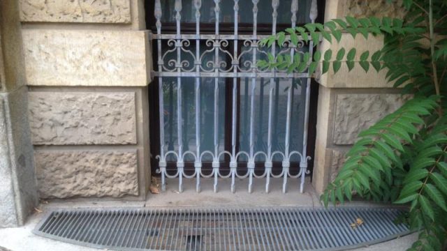 Wer bitte baut ein großes Fenster, dessen Oberkante sich knapp 2 Meter unter Straßenniveau befindet, und schachtet insgesamt 5 Meter in die Tiefe? Um möglichst viel Dreck zu sammeln? So sieht es heute aus.